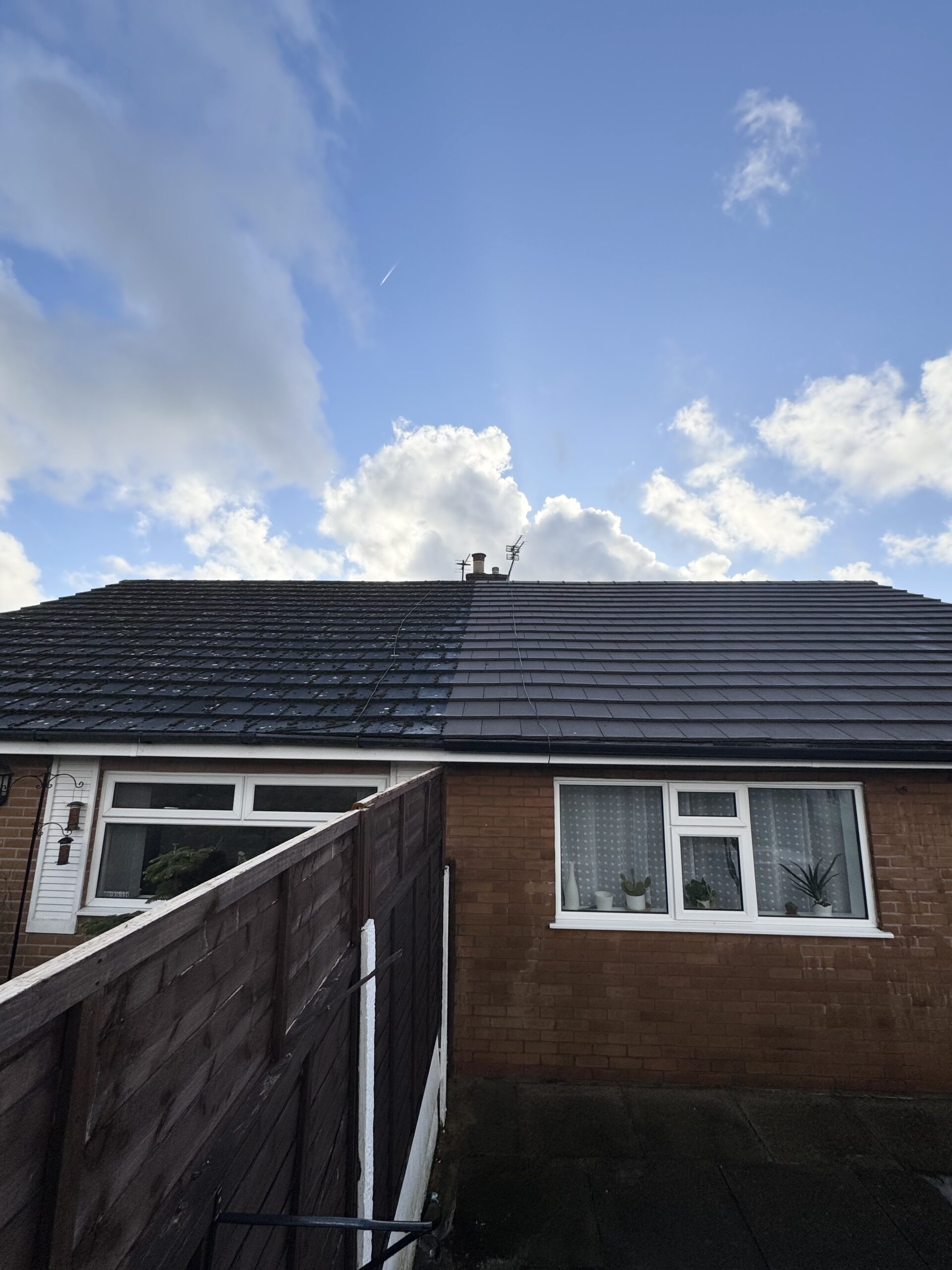 Another roof transformed! Wait to see the end results on this one How long do we think until the neighbour has there’s done? Lightly cleaned Gutters cleared Cleaned down UPVC cleaned Biocide treatment applied